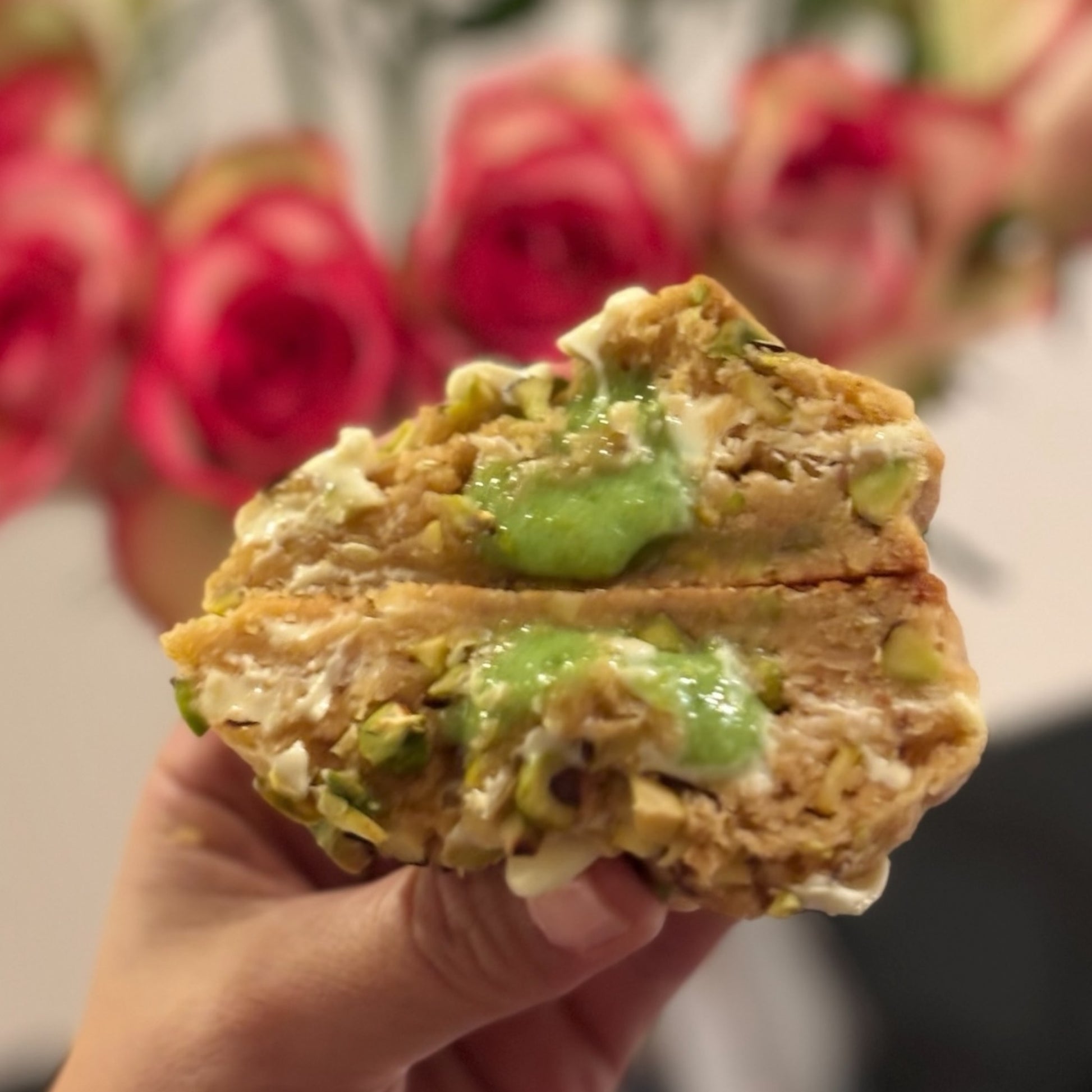 Experience nutty indulgence with our Chunky Pistachio & White Cocolate Cookie — thick, chewy, and loaded with creamy white chocolate chunks. At the heart of each cookie lies a smooth pistachio ganache center, creating a rich and luxurious bite that’s both sweet and satisfyingly nutty.